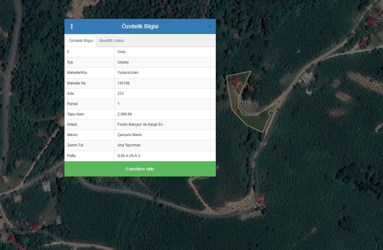 Taşınmaz; Ordu İli, Ulubey İlçesi, Yukarıkızılen Mah. 223 Ada 1 Parselde yer almaktadır. Tapuda "Hisseli Fındık Bahçesi ve Kargir Ev" olarak belirtilmiştir. Parsel toplam 2.080,68 m² yüzölçümlü alan üzerinde yer almakta ve ½ hisseli olup, hissesine düşen alan 1.040,34 m²'dir.